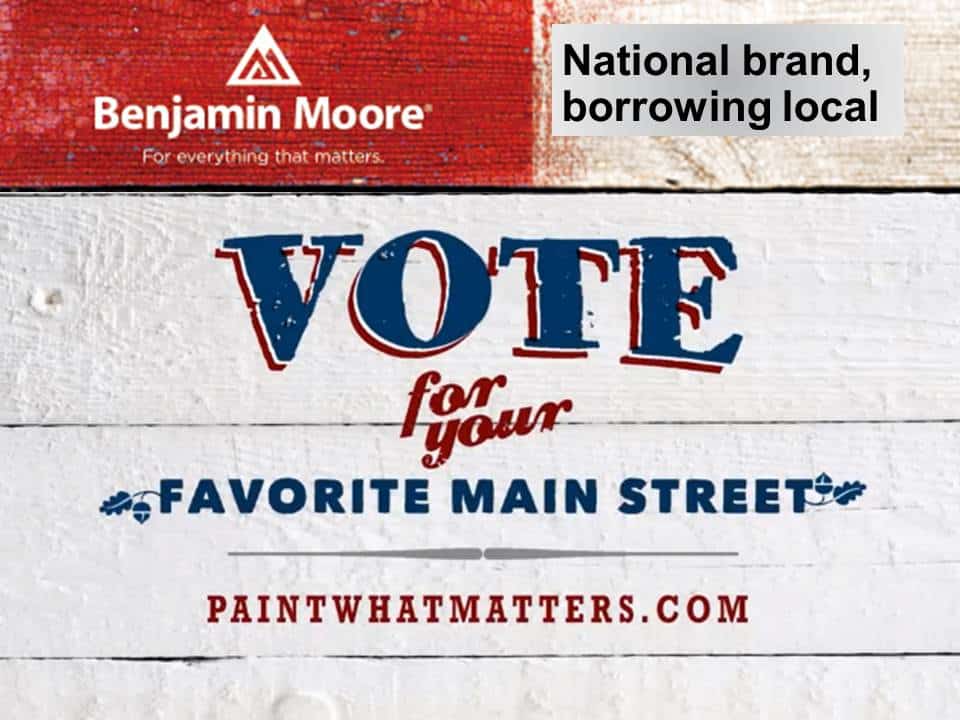 Paint company Benjamin Moore is identifying with Main Streets through a campaign to repaint 20 downtowns. They’re backing it up with TV commercials praising downtowns, the “three-story highrise,” and the small businesses that typify Small Town Rules.